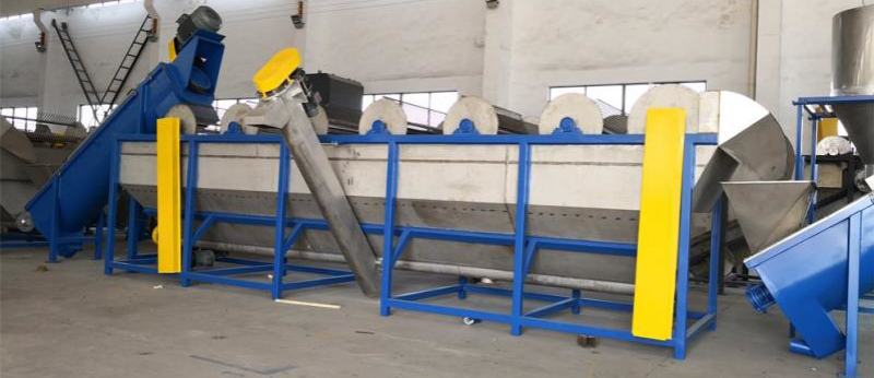 Untuk memastikan kebersihan dari material, bahan-bahan yang telah dihancurkan akan dicuci terlebih dahulu dalam tangki pencucian plastik, yang biasa disebut sink float tank. Tangki pencucian ini dilas menggunakan pelat baja untuk memberikan ketahanan yang baik terhadap korosi dan karat. Sebuah pemutar atau roller, dipasangkan pada tangki ini guna memastikan pergerakan material secara otomatis di dalam mesin. Setelah proses pencucian, lumpur endapan dalam jumlah besar biasanya akan tertinggal di dalam tangki, karena hal ini, kami memasangkan alat sekrup pada bagian bawah untuk mengeluarkan endapan tersebut secara otomatis, tanpa perlu pembersihan secara manual.